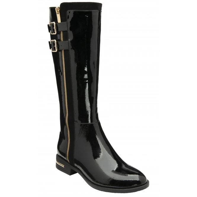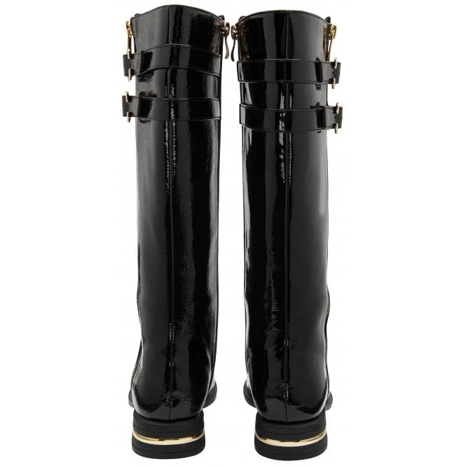 The Lotus Louella knee high boot draws inspiration from equestrian trends. Sumptuous imi-suede trims sit alongside the glossy patent upper, which also features an exposed gold zip and a double buckle feature. This black knee high boot rests on a slight 3cm heel that incorporates a decorative metal trim. Louella is perfect for ramping up every day looks!