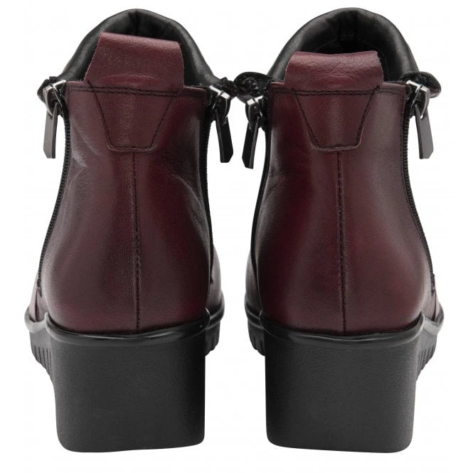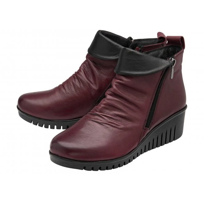 Exceptionally comfortable and a true delight to wear is the Lotus Cordelia ankle boot. This understated burgundy boot is constructed from premium leather with subtle ruche detailing on the upper. As well as incorporating an exposed side zip and a turn down collar, this women’s burgundy leather ankle boot rests on a 4.5cm wedge heel. The Lotus Cordelia boot really is the perfect accompaniment to casual looks.