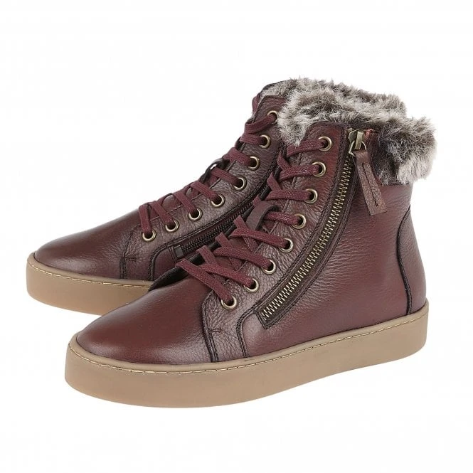 Make light work of autumnal dressing and step out in a pair of Siobhan high top trainers from Lotus by Stressless. Crafted from premium leather, this lightweight and casual women’s lace-up burgundy trainer is accompanied by a functional outside zip and a sumptuous faux fur trim. As well as having a distinctive finish, this Lotus women’s casual trainer also boasts comfort features including shock absorbing properties and a padded insock.