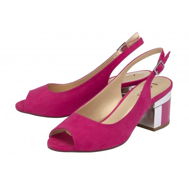 Set to slide seamlessly into your hard-working wardrobe is the Lotus Evelyn slingback shoe. This understated fuchsia peep-toe shoe is crafted from microfibre, it encompasses an adjustable slingback and a contemporary 6.5cm block heel that is enhanced by a decorative metal plate and trim. This Lotus women’s fuchsia shoe coordinates effortlessly with the Claire handbag.
