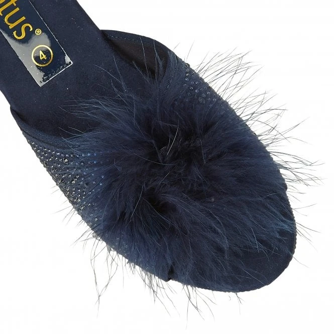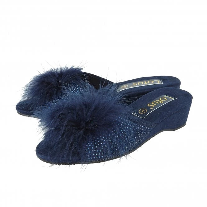 The ever popular Lotus Allure slipper gets an update to further accentuate its glamorous flair and appeal. As per its predecessors a striking feather pom-pom is incorporated, but this season’s new style sees the addition of sparkling diamantes adorning the microfibre upper. This open toe, navy women’s Lotus slipper also boasts a subtle wedge heel and an extra padded cushioned in-sock to make it exceptionally comfortable.