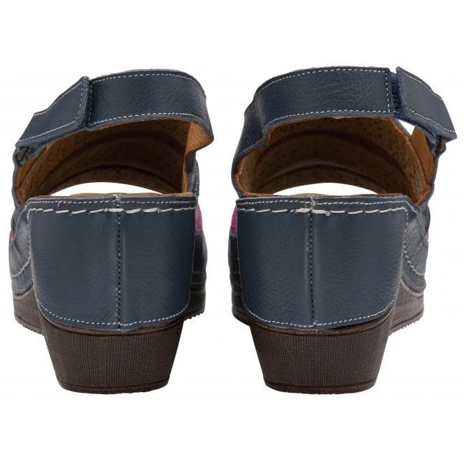 A trio of colours teamed with decorative punchwork can be found on the leather upper of the Lotus Neylan sandal. This women’s open toe navy, fuchsia and white sandal also encapsulates an on-trend 7cm wedge heel and comfort attributes including a leather lining, a cushioned in-sock and an adjustable rip-tape slingback for a custom fit.