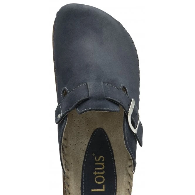 Set to become a firm favourite this season, is the Lotus Evelina mule. This women’s, round toe, backless silhouette takes its styling cues from a closed toe clog. This on-trend silhouette is constructed from nubuck and features a leather insock and lining, plus buckle detailing and blanket stitching that decoratively joins the upper and cork effect sole unit. This Lotus women’s navy clog is ideal for teaming with casual looks.