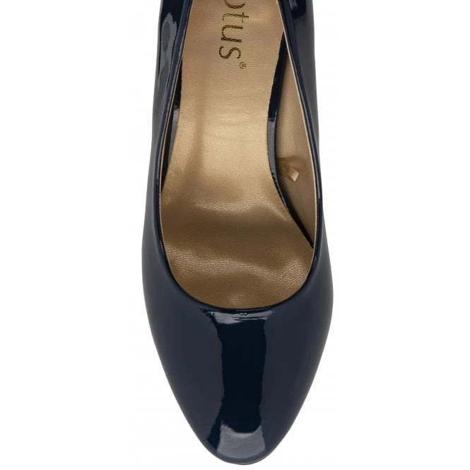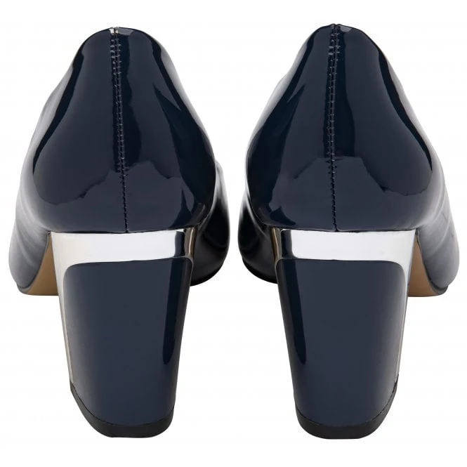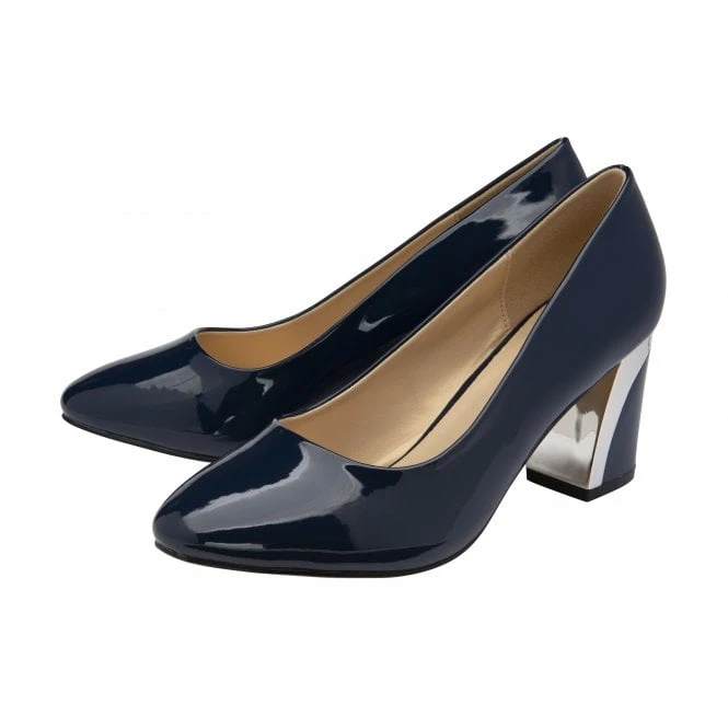 Easy to wear and even easier to style is the Lotus Eden court shoe. This women’s navy heeled pump is set on a 7cm block heel that is accentuated by a decorative metal plate, it features an almond pointed toe and a glossy patent upper. The understated charm and versatility of this ladies’ court shoe will ensure that it is one of the hardest working pairs in your wardrobe.