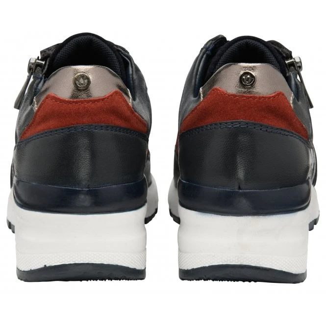 Reptile printed side panels, flashes of red suede, an exposed zip and a crisp white 4.5cm wedge heel all accentuate the Suzette trainer from Stressless by Lotus. As well as being crafted from premium leather, this lightweight lace-up women’s trainer boasts a host of comfort features including shock absorbing properties within the cushioned insock and a padded ankle collar. This exceptionally wearable women’s navy trainer will certainly pair well with a wealth of looks.