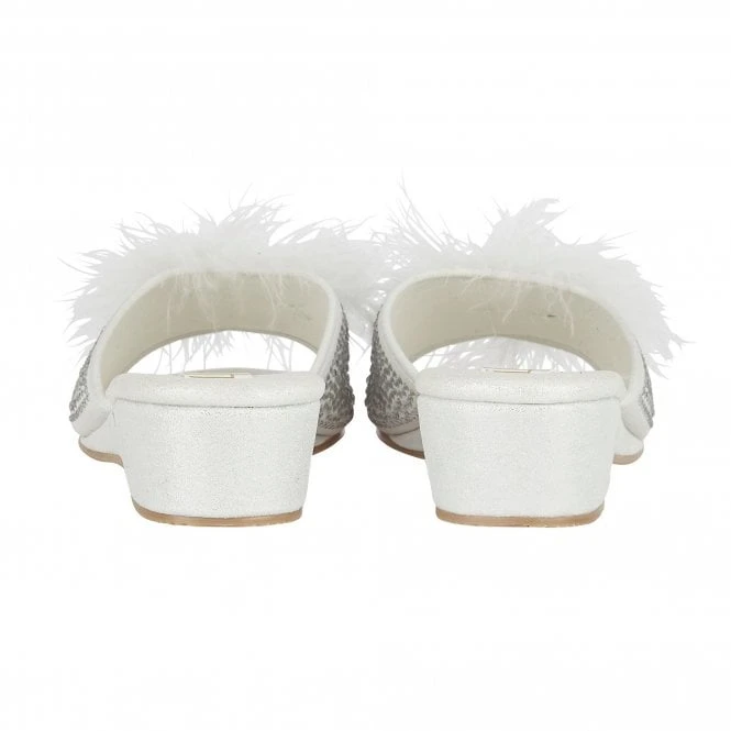 The ever popular Lotus Allure slipper gets an update to further accentuate its glamorous flair and appeal. As per its predecessors a striking feather pom-pom is incorporated, but this season’s new style sees the addition of sparkling diamantes adorning the shimmer textile upper. This open toe, silver women’s Lotus slipper also boasts a subtle wedge heel and an extra padded cushioned in-sock to make it exceptionally comfortable.