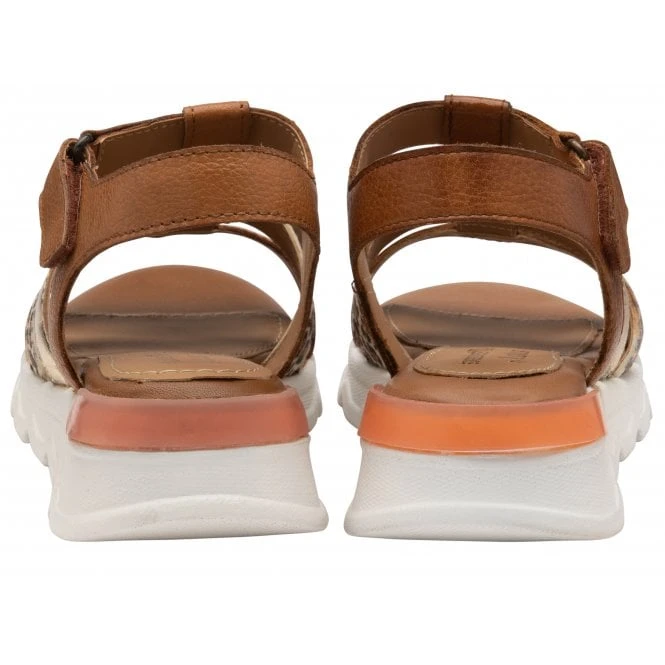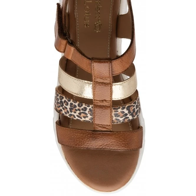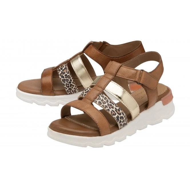 The Shiloh Stressless by Lotus sandal is a true season essential. As well as taking styling cues from a gladiator sandal, this multi strap sandal is further enhanced by metallic detailing and a leopard printed strap to ensure that it is season relevant. Resting on a fashionable cleated sole unit and encompassing an adjustable rip-tape fastening ankle strap and shock absorbing properties in the cushioned insock, this exceptionally comfortable women’s tan sandal is a serious contender for being the must-have sandal of the season!