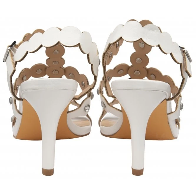 The Lotus Inaya open toe heeled sandal will add a dose of glamour to any warm weather looks. This women’s white sandal is crafted from faux leather and boasts straps that have been cut with a scalloped edge and each circle is finished with a sparkling gem centre piece. Nestled on a 9cm stiletto heel and featuring an adjustable ankle strap fastening, this Lotus ladies’ sandal is certainly worthy of a fresh pedicure.